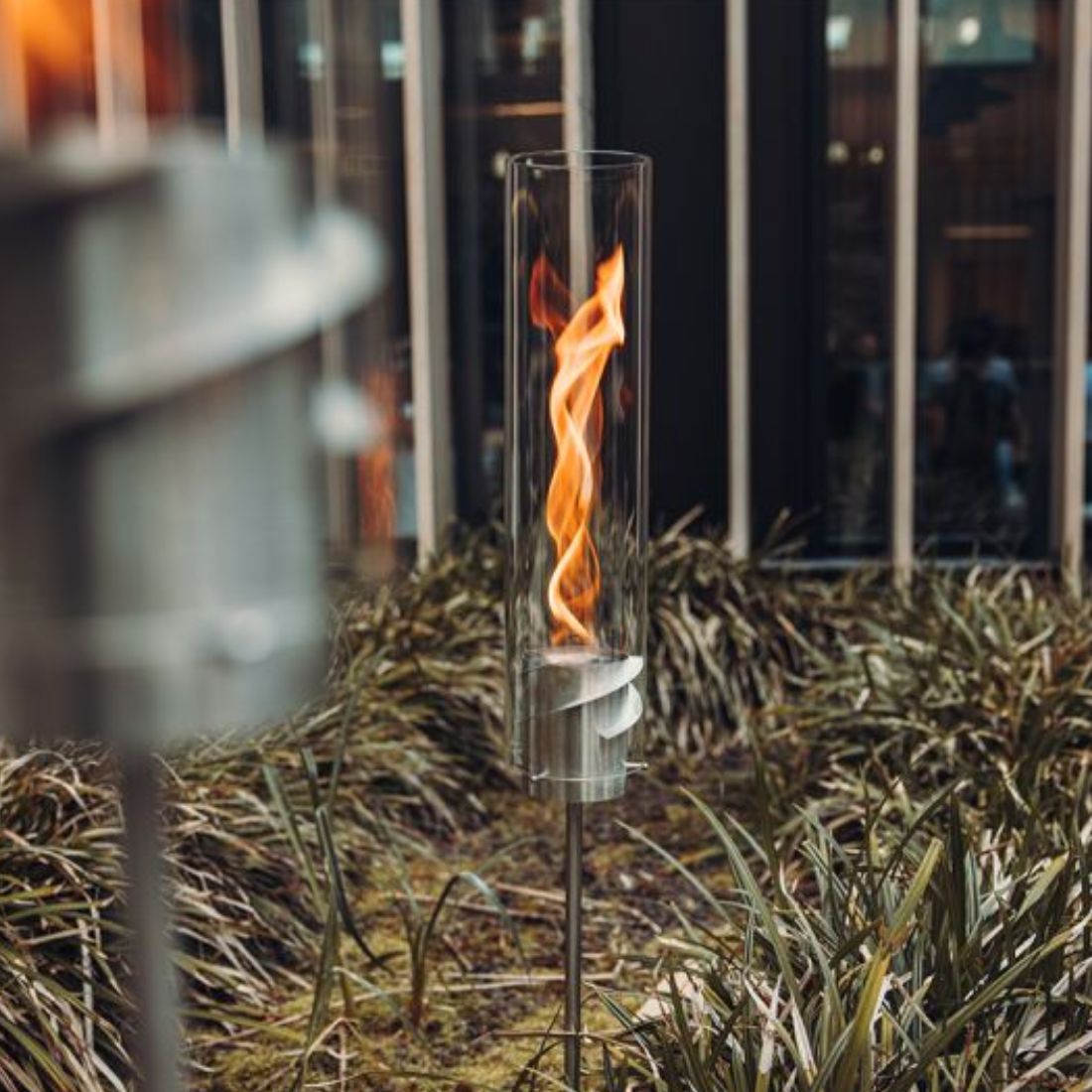 Ce cylindre en verre décoratif crée une ambiance de feu de camp moderne, aussi bien sur votre balcon, dans votre salon ou sur votre terrasse.