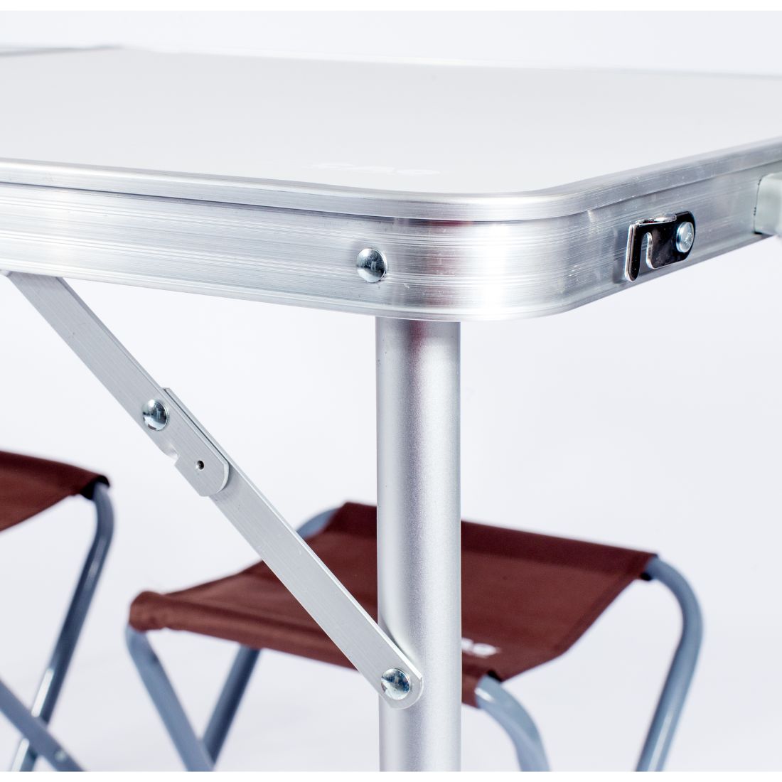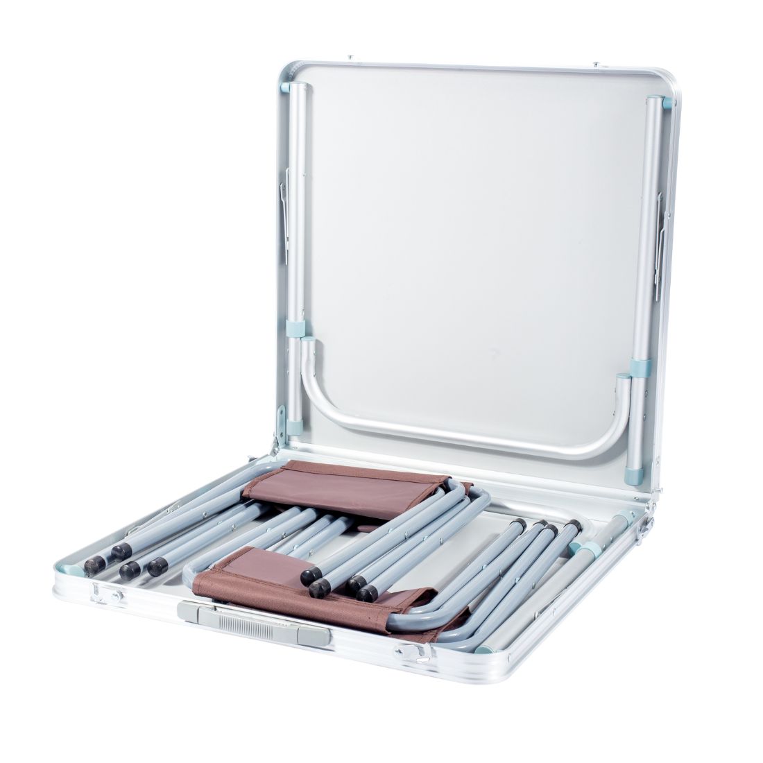Découvrez la table valise portable en aluminium, livrée avec quatre tabourets bleus assortis.